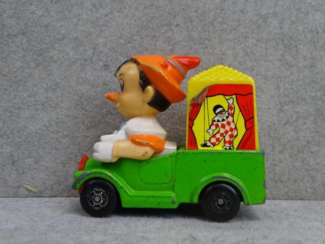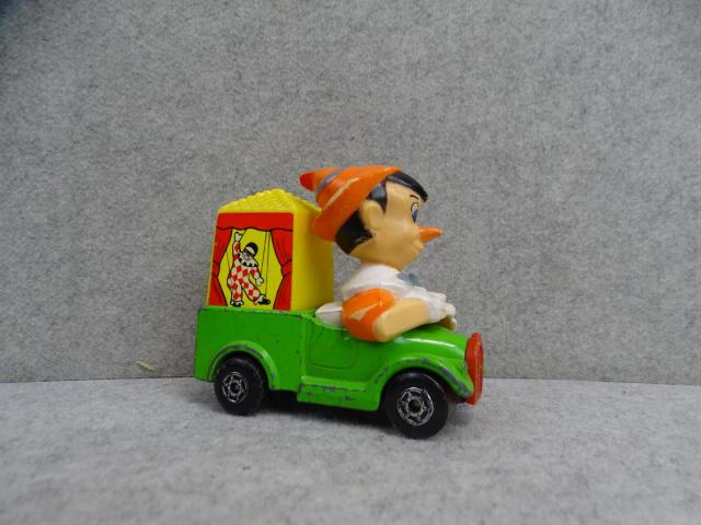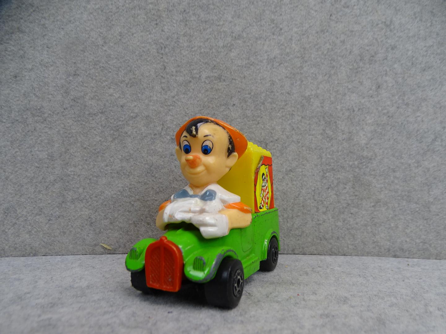 Een groene Matchbox truck met niemand minder dan: "Pinokkio" achter het stuur. Achteraan staat een circustent met versiering van een dansende houten pop, Onderaan op de metalen bodemplaat staat: "Matchbox Series N°7, Walt Disney Production, Made in Hong Kong, 1979, Lesney". Met andere woorden deze Disney Matchbox is bijna een halve eeuw oud is.