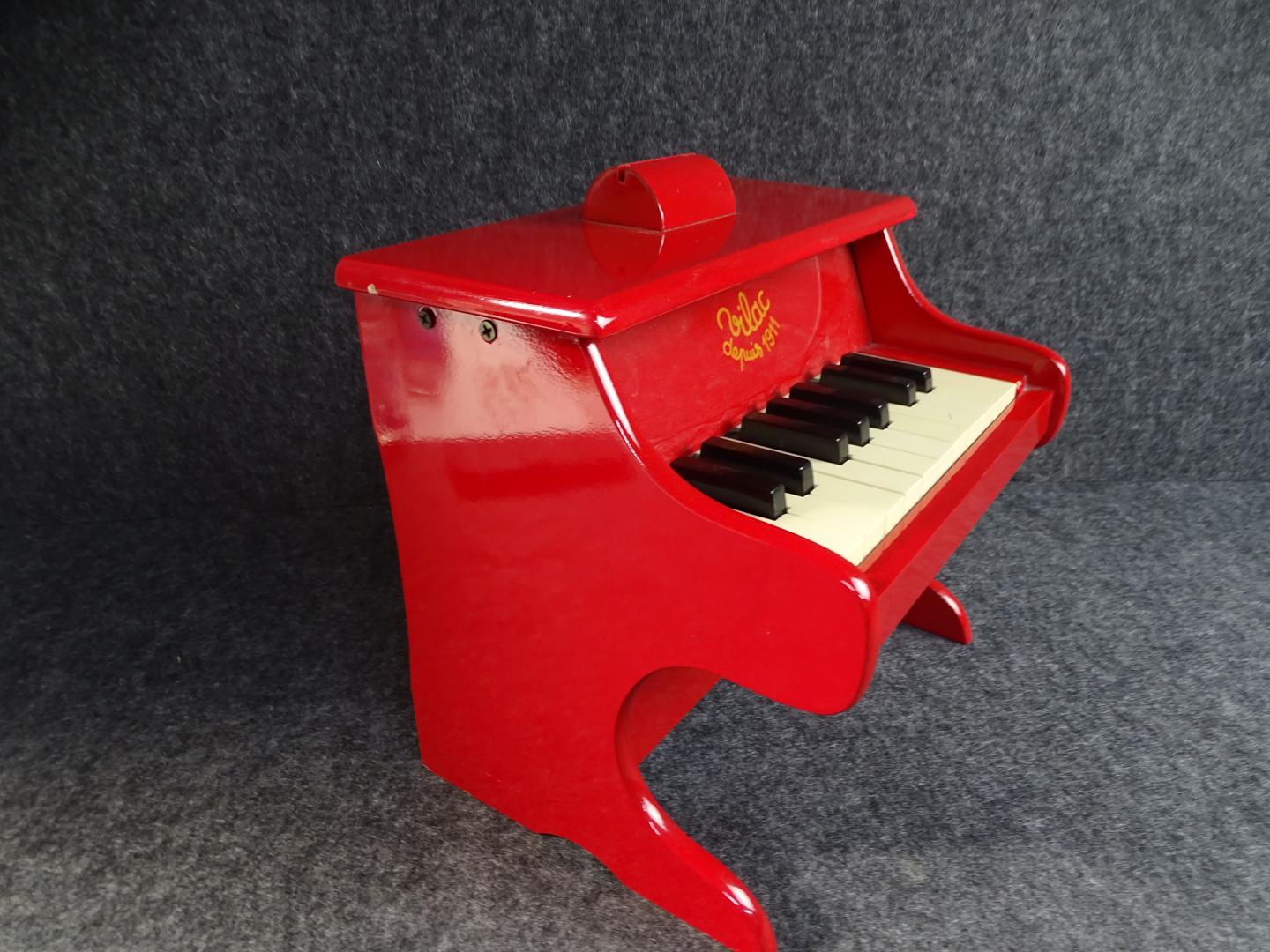 Een roodgelakte houten mini-piano van het merk 'Vilac'. Dit Franse bedrijf is sedert 1911 al gespecialiseerd in houten kinderspeelgoed.