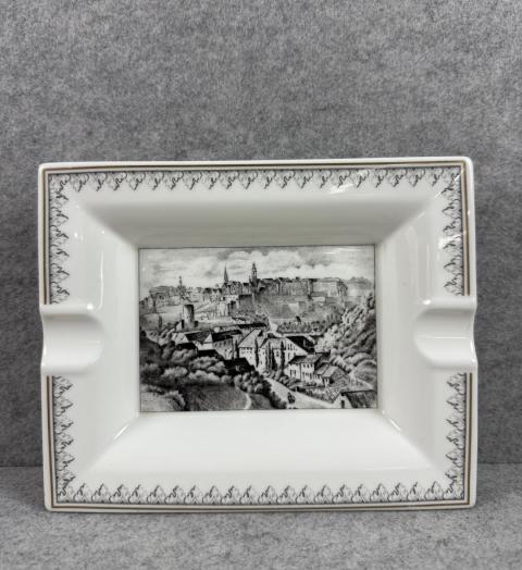 Stijlvolle porseleinen asbak van Villeroy & Boch, met stadsgezicht van Luxemburg. Het porselein is voorzien van fijne details in zwart-wit en afgewerkt met een goudkleurige rand. Een fraai verzamelobject, niet alleen voor rokers maar ook voor liefhebbers van decoratief porselein.
