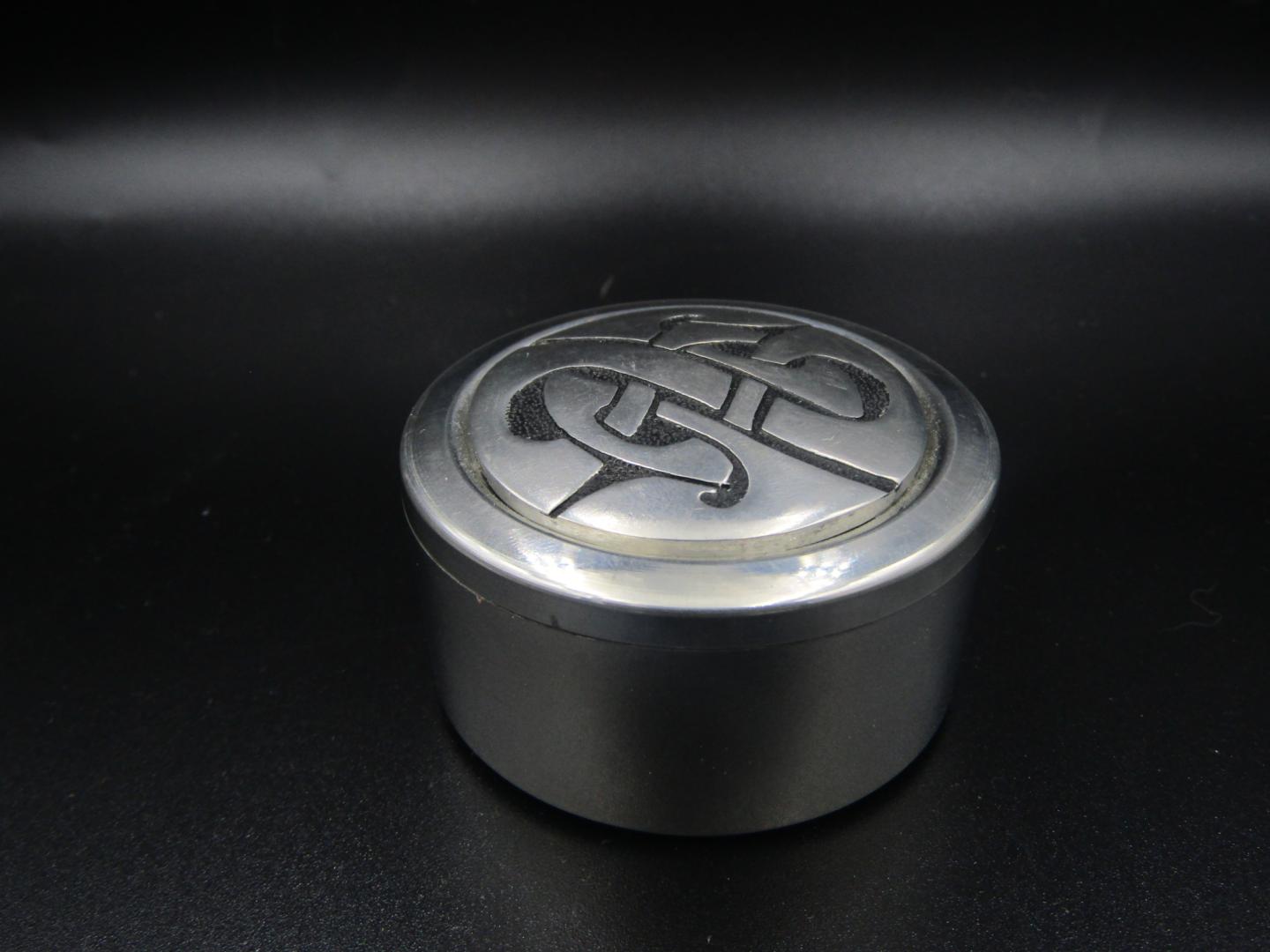 Een elegant Keltisch pillendoosje van "St Justin". Dit fraaie doosje is vervaardigd uit hoogwaardig tin en versierd met een prachtig Keltisch knoopwerk‑ontwerp typisch voor het ambachtelijk vakmanschap van "St Justin".