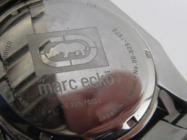 Een horloge van 'Marc Ecko, ontwerper van het Amerikaanse graffiti- en Hip Hop label "Eckō Unltd." Dit model heet "The Shadow" is gemaakt in RVS en komt met een vlindersluiting. Dit prachtige horloge komt met een reservering met ingelegde steentjes en met een reserve schakel. Achteraan het horloge vinden we het neushoorn logo van het merk en: "by Marc Ecko, e22570g1, Japan Movement, No 00-829-1972, Stainless Steel Case.