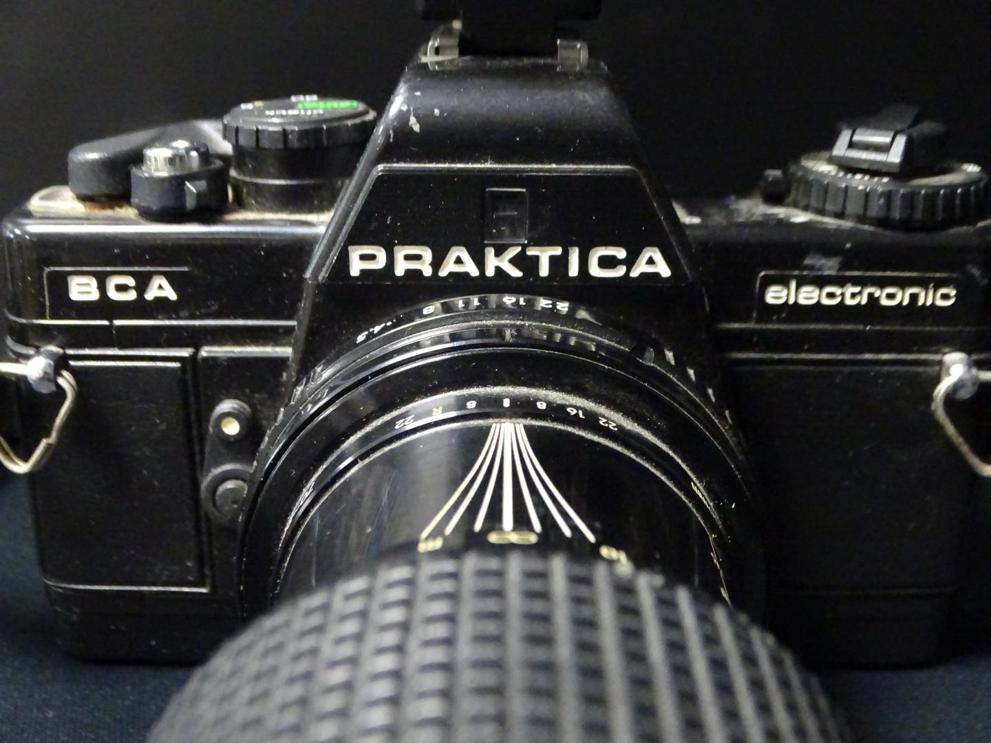 De Praktica BCA electronic behoort tot de bekende B‑serie van Pentacon Dresden, met elektronische sluiterregeling en het Praktica PB‑bajonet. Komt met een Agfatronic 200 B flitser en Practicar Pentacon Telelens.