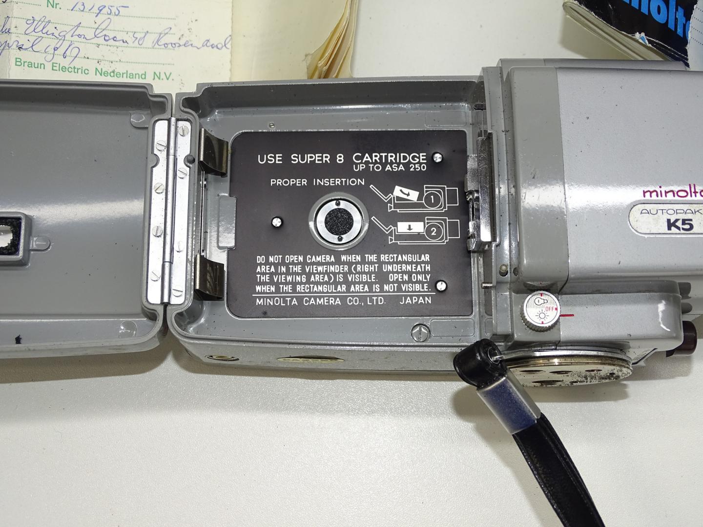 Een robuuste videocamera voor Super 8 cartridges van Minolta, de Autopak-8 K5. Hij was destijds het topmodel binnen het segment en was een erg kostelijke investering. Deze camera zit in een lederen Minolta draagtas en komt met de originele gebruiksaanwijzing.